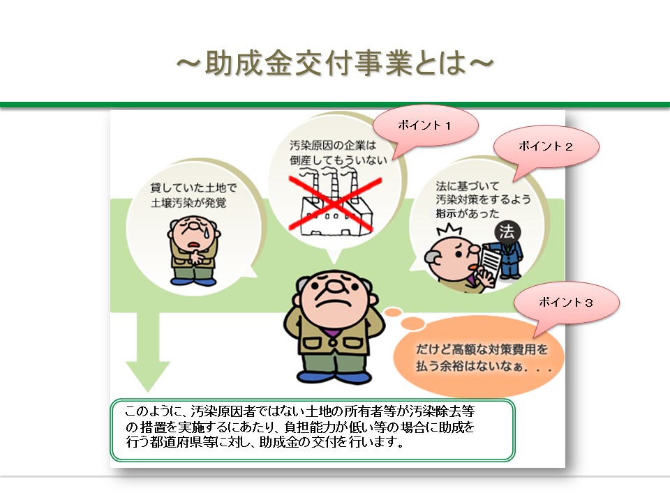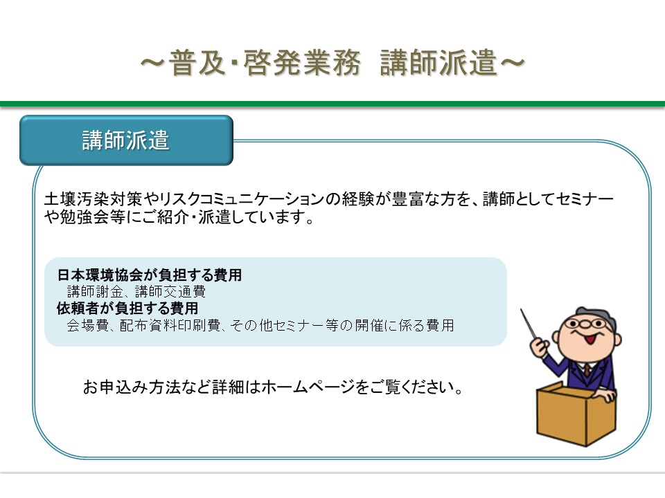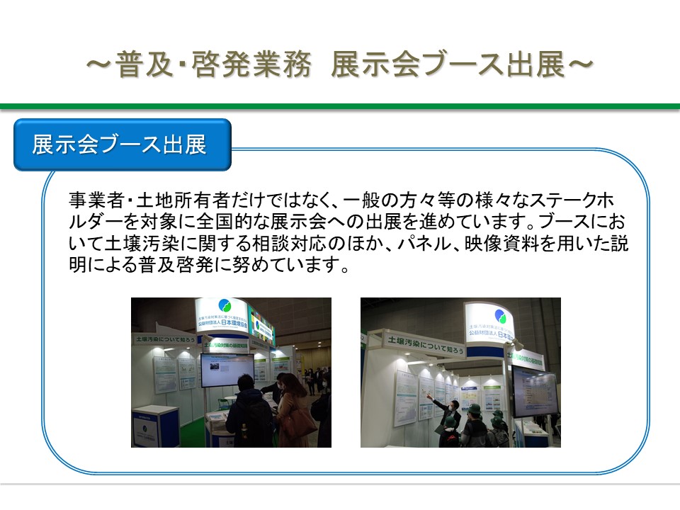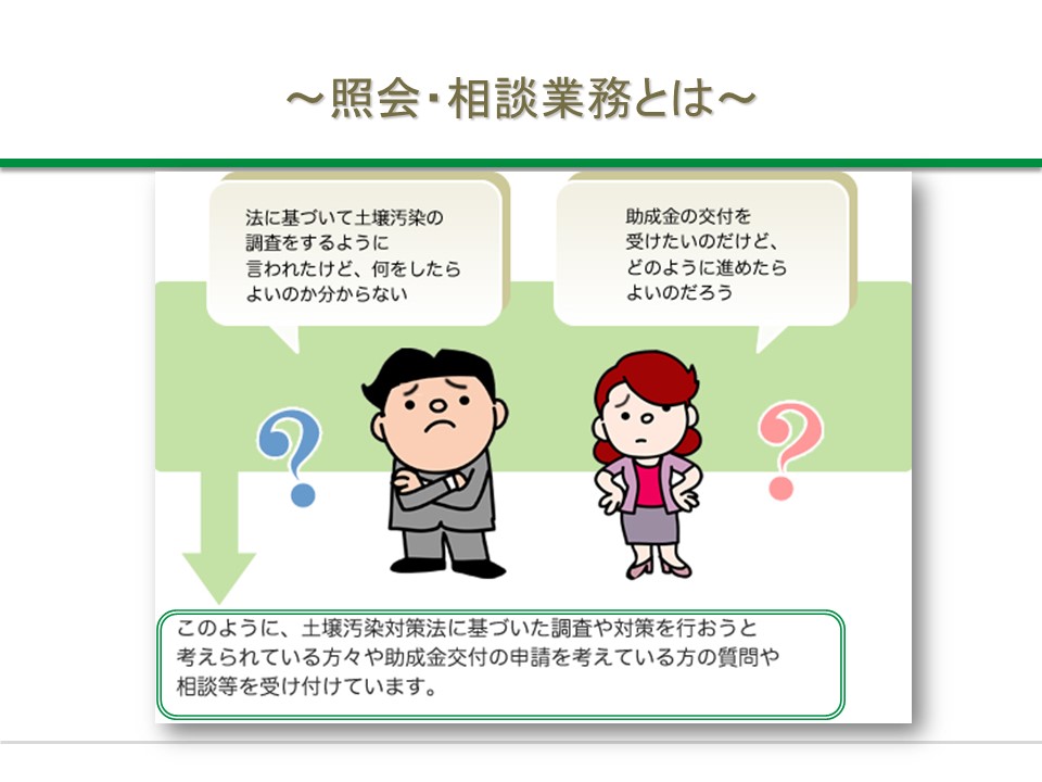 - 公益財団法人日本環境協会は平成14年に環境大臣から土壌汚染対策法に基づく指定支援法人に指定され、法に定められた支援業務を行っています。汚染の除去等の対策を行う土地所有者等に対しての助成金交付事業、土壌汚染対策法に基づいた調査や対策を行おうと考えている方、助成金の申請を考えている方への照会・相談事業、土壌汚染対策に関するパンフレットの配布、無料セミナーの開催、土壌汚染の専門知識をもった講師の派遣等の普及・啓発事業を行っています。
