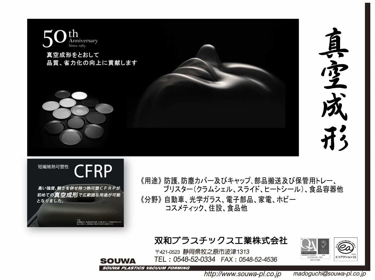 - ・各種真空成形品(部品トレー、キャップ、ブリスターケース等)を展⽰致します。 ・環境配慮型素材(リサイクルPET、バイオマス素材等)にも対応しております。・⾼い強度と軽さを併せ持つ『短繊維熱可塑性CFRP』 が初めて真空成形に適応可能となりました。 ・その他、各種新素材の真空成形品