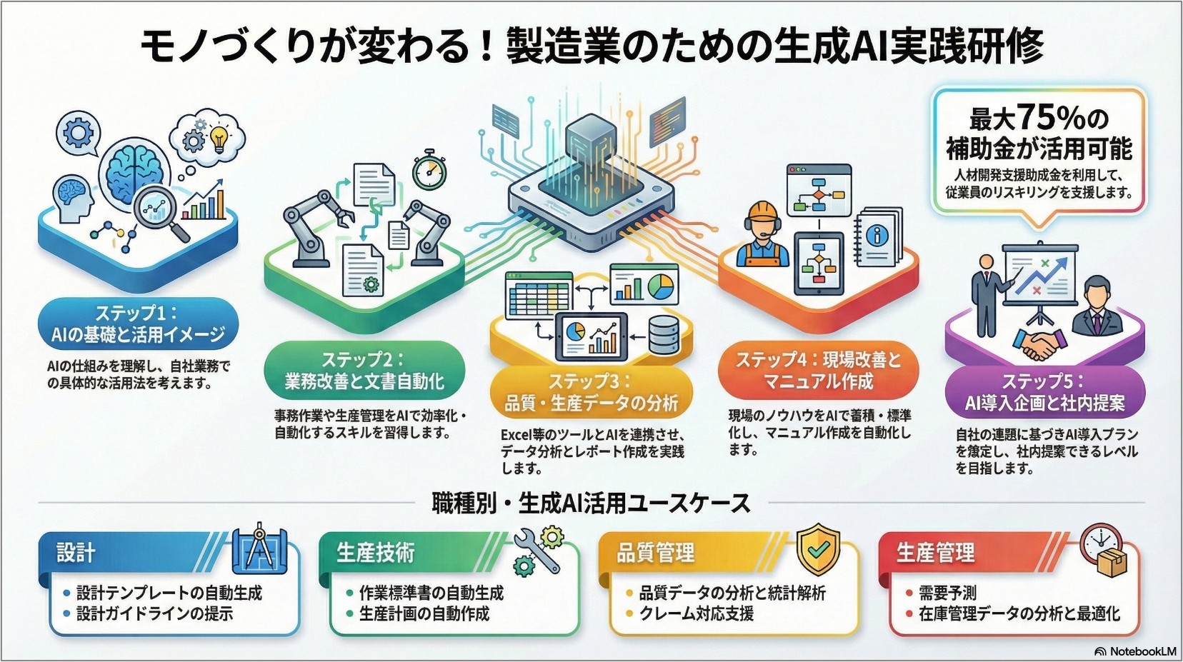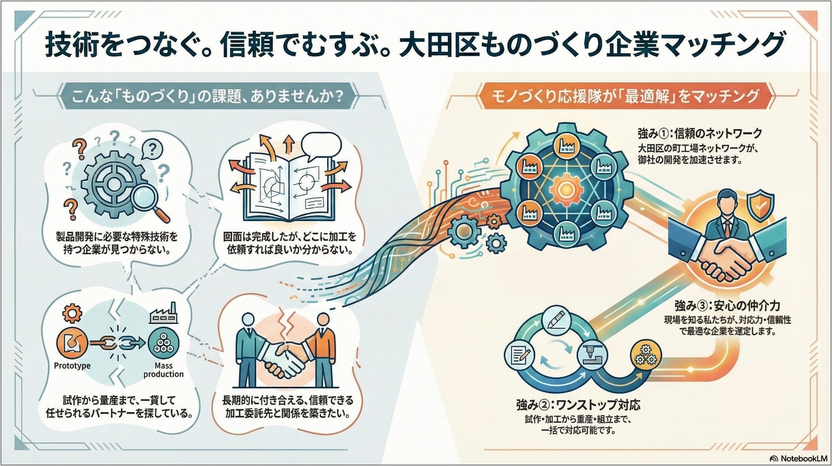 - 【どうする!? モノづくり】」中小企業の課題解決の方策をお伝えします。 ①どうする!?生成AI:製造業での生成AI活用について ②どうする!?価格転嫁:価格交渉に向けて(日頃の準備と交渉方法) ③どうする!?顧客開拓:身近なホームページを営業に変える方策 ④どうする!?仲間づくり:御社の技術課題や開発ニーズに最適なパートナーをマッチング ⑤どうする!?経営改革:短時間で経営戦略案つくりを支援します ⑥どうする!?人手不足:省力化のためのロボット導入の支援をします