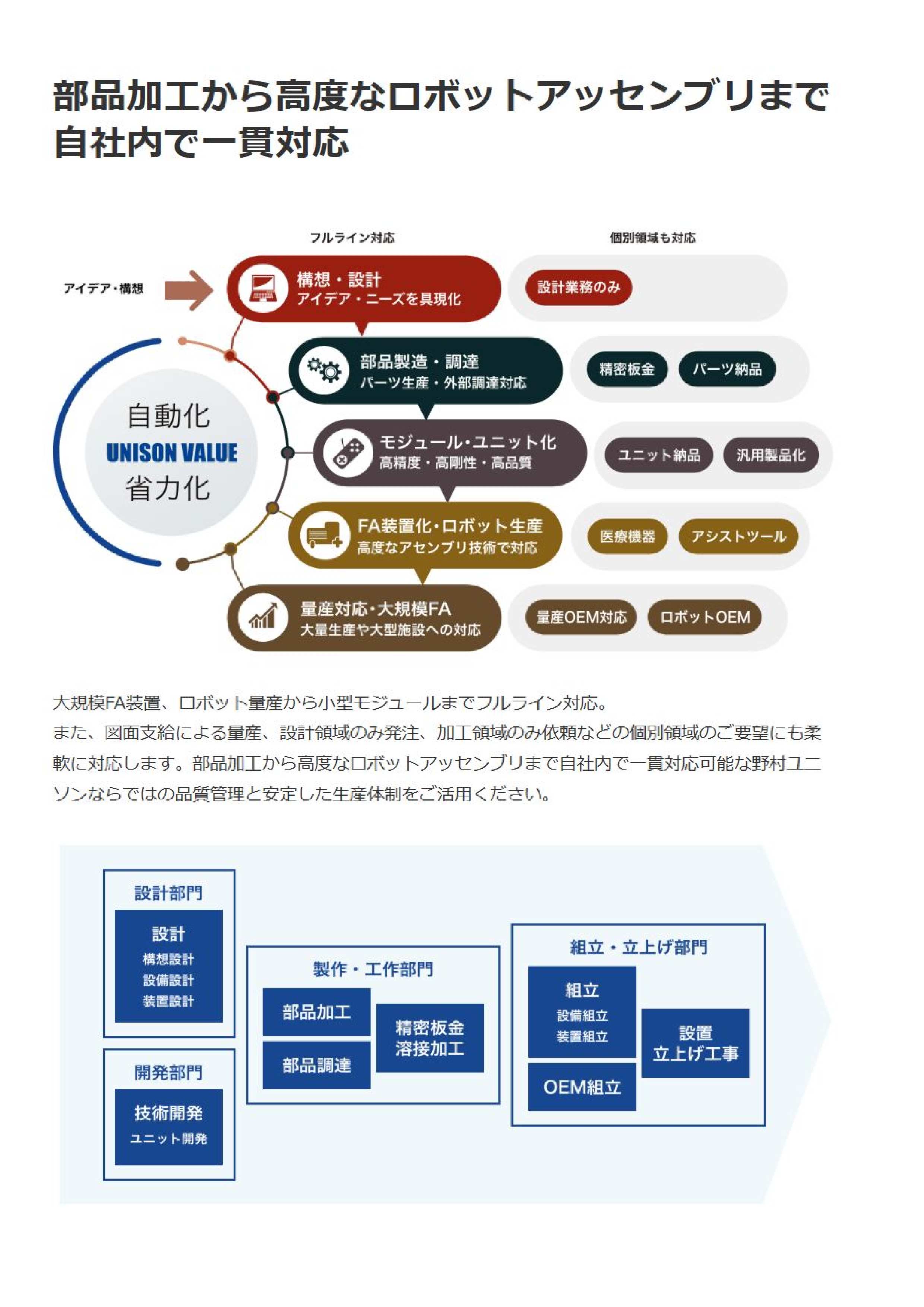 - 野村ユニソン株式会社では、二つの分野における強みをご提案します。 一つ目は、鍛造・ダイカスト・切削加工・組立を中心とした素形材成形分野です。金型設計・製作から試作、量産までを一貫して対応し、安定した品質とコスト競争力、確かな納期対応を実現します。 二つ目は、生産性向上や省人化を支える装置設計・製作分野です。工程改善や自動化ニーズに対し、構想設計から製作、立上げまで現場目線でトータルにサポート。 素材と装置の両面から、ものづくりの課題解決に貢献します。
