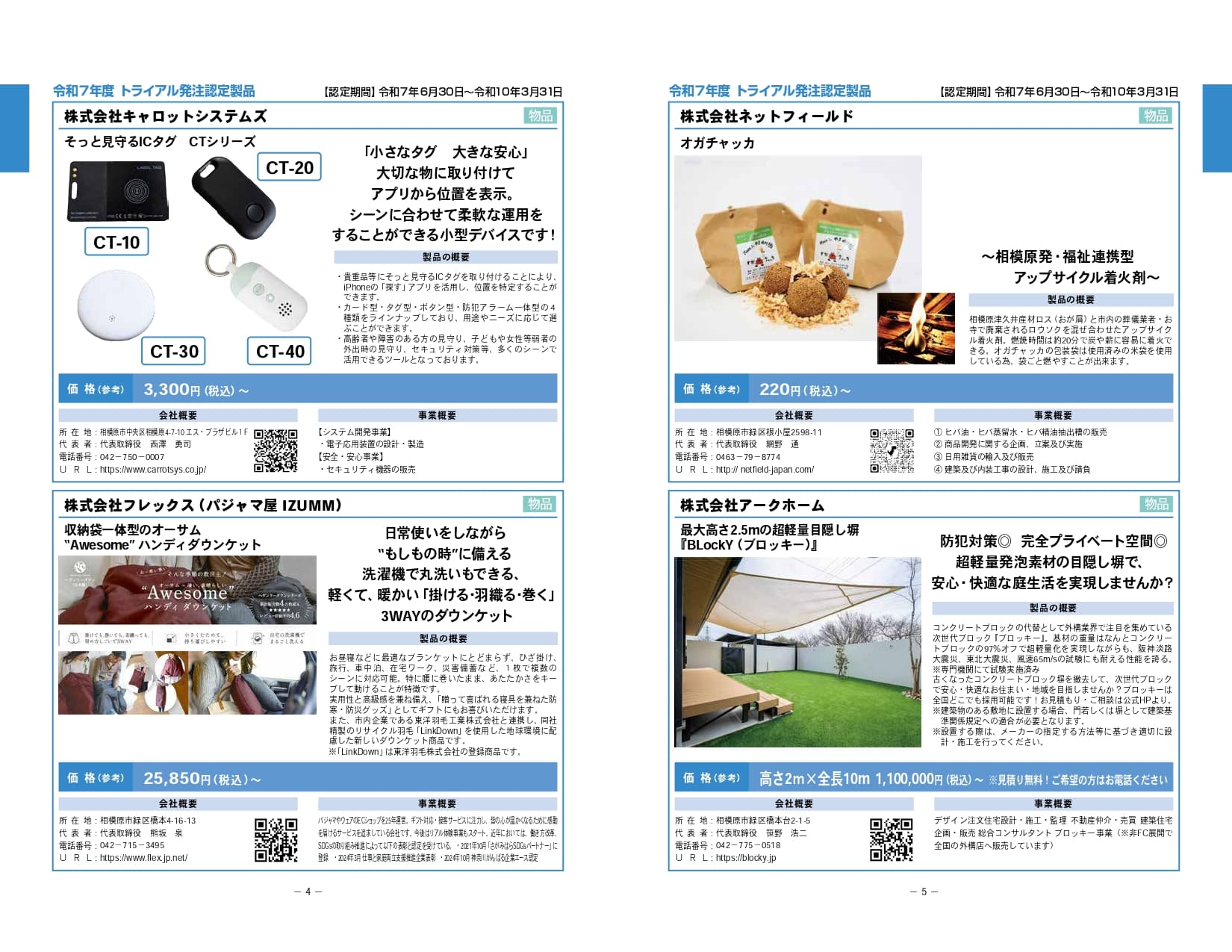 - 相模原市トライアル発注認定制度は、相模原発の優れた新製品や新サービスの販路開拓のため、市のHPへの掲載や、展示会への出展、市による試験購入などを通じて、積極的に市内外へ発信する制度です。当ブースでは令和7年度に認定された製品をご紹介いたします。各社のPRページもぜひご覧ください。 <出展企業(50音順)>株式会社アークホーム/アイフォーコム株式会社/アクセスエンジニアリング株式会社/株式会社キャロットシステムズ/株式会社コバヤシ精密工業/株式会社TherapiCo/田中プレス工業株式会社/株式会社トモエレクトロ/株式会社DONKEY/株式会社ネットフィールド/株式会社メディアロボテック/株式会社リガルジョイント