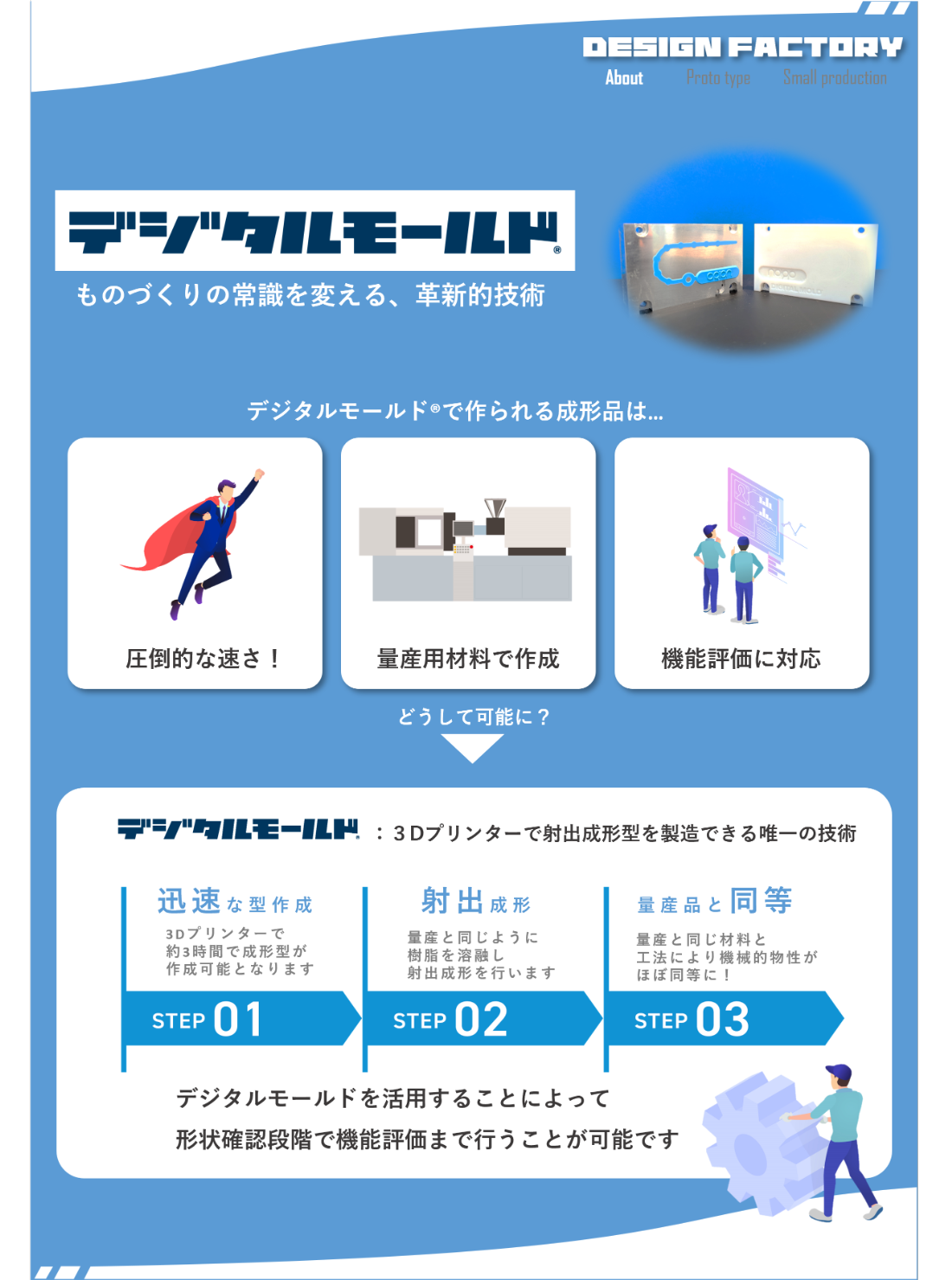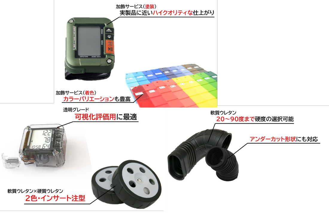 - 量産前のリスクを“試作段階で見える化する”短納期ソリューションを展示。【デジタルモールド®】樹脂型を最短2時間でつくり、量産と同じ材料で「射出成形」にて試作。外観や強度、耐薬性などを形状確認段階で確認できます。また型材質をアルミへ置換し、~3000個Lotの小ロットまで対応。【ゴム異素材一体成形】ゴム+樹脂/金属を高密着で一体化。パッキン不要の防水・防塵、滑り止め、絶縁、を一工程で付与し、部品点数と組立工数を削減。後工程を減らし、信頼性も向上。【注型】金型レスのシリコーン型で最短3日、費用は金型の数十分の一。指定色、光沢やシボなど意匠も柔軟に対応します。多品種少量や補給部品の在庫圧縮にも。