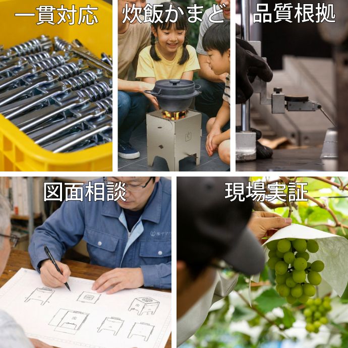 - 当社は金属加工メーカです。自社農園を実験場に、使う側の目線で困りごとを見つけ、金属加工で解決して改善を蓄積してきました。その象徴が、米作り工程で発生する副産物「もみ殻」を燃料に、ご飯を炊ける携帯型の炊飯かまどです。ブースでは本製品「にわ先かまど」と加工サンプルを展示し、品質の根拠を提示します。図面相談、試作、量産立上げまで入口をご用意します。 ※「象徴」の理由は、“燃焼・熱・携帯・安全・耐久”など複数要件を同時に満たす必要があり、加工屋の総合力(設計・試作・量産性)が一番出るからです。本文ではこれを「象徴」の一言に圧縮しています。
