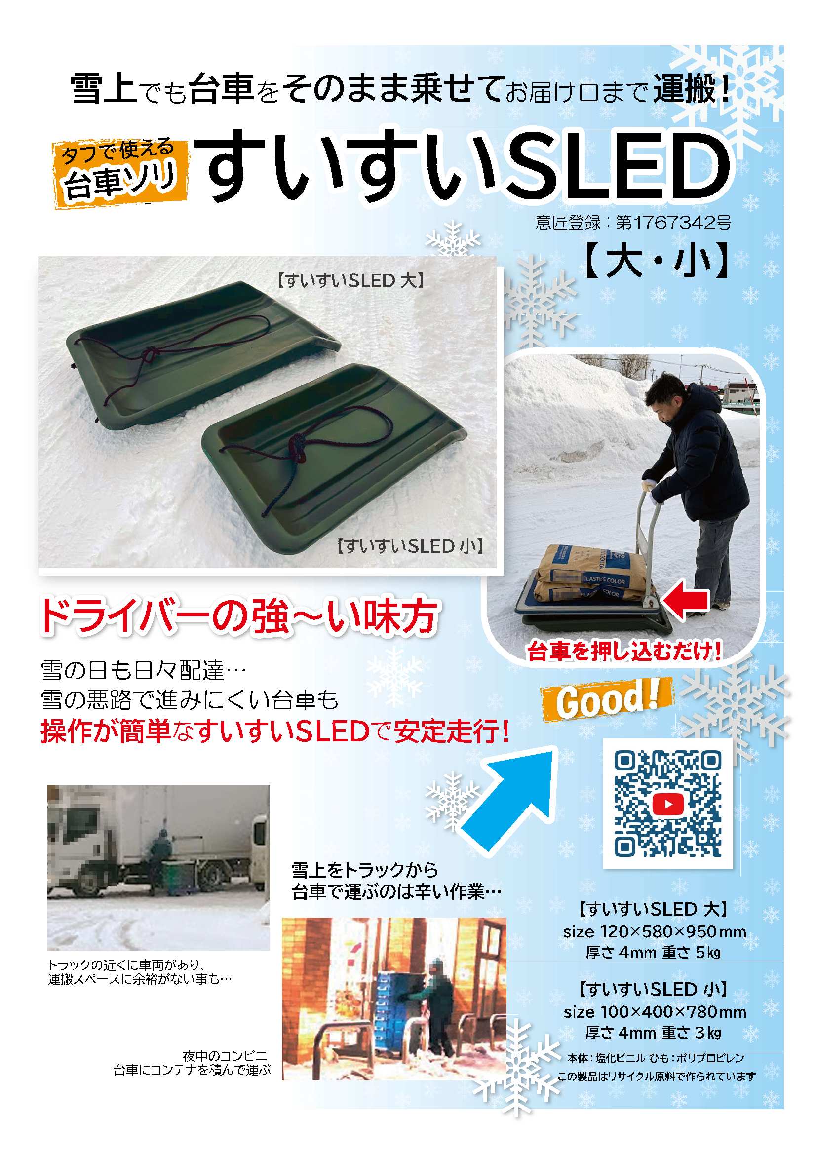 - ハンターとともに開発したクマ・シカ・イノシシ等大型動物回収専用ソリ「ベアースレッド」、台車を使用して納品・作業する方へ台車を乗せたまま雪面を走れる特殊ソリ「すいすいスレッド」、コアなアウトドア派に送るカモフラ柄に塗装した「アーススレッド」、を展示します。新しい開発も承っています、会場でご相談ください。