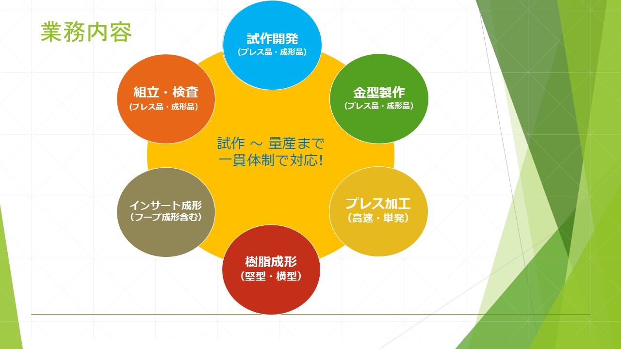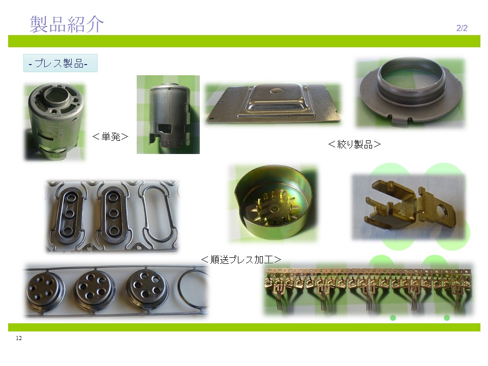 - 創業44年を迎えた当社は、精密小物プレス加工、インサート成形を中心に、開発(試作)~量産までの一貫体制を構築しております。設計から金型製造を行い、自動車部品、電子部品、スマートフォンなどの幅広い部品の生産・納入の実績を有しております。エンドユーザーには自動車部品メーカーもあり、納期・品質面での信頼を勝ち取って今日まで至っております。また、2017年にタイ(サンムトプラカン)へタイ工場を設立し、オートバイメーカーなどへの実績も有しております。