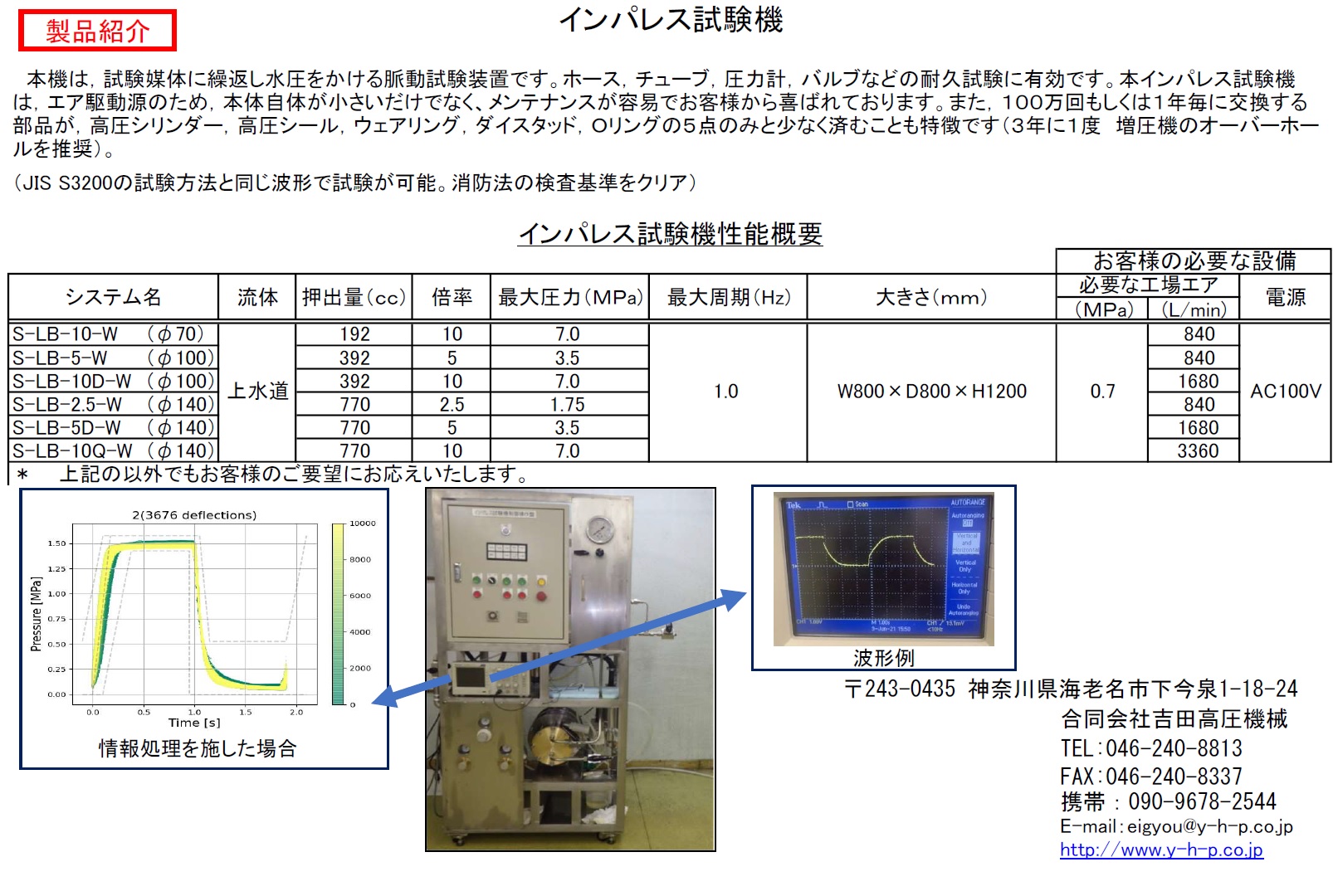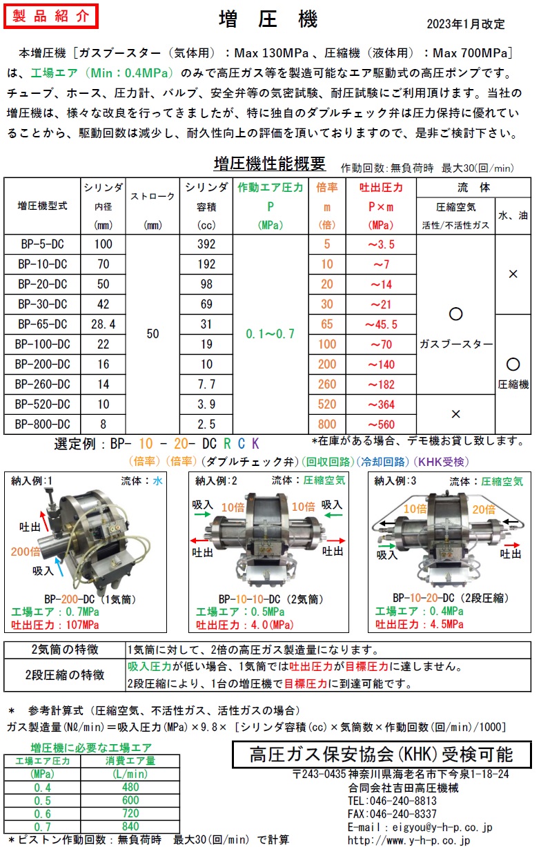 - 当社は、日本で数少ない自社製のエア駆動式高圧ポンプ製造会社です。当社の増圧機は、様々なお客様からのご要望にお応えし、改良を重ねた結果、耐久性が高くなりました。 本増圧機を用いた、気密試験機、耐圧試験機、破壊試験機、インパレス(脈動、繰返し衝撃)試験機、冷間等方加圧(CIP)装置導入の際は、お客様と打合せに充分時間を掛け、ご使用条件を考慮した高圧システムとして設計、製造、販売致します。 また、圧力計、安全弁等の保安検査、気密試験、耐圧試験、繰返し衝撃試験、脈動試験、破壊試験の委託検査を承ります。出張では、CIP装置、HIP装置、水素ステーション、高圧プラント等の高圧配管工事や耐圧試験、気密試験の実績もあります。