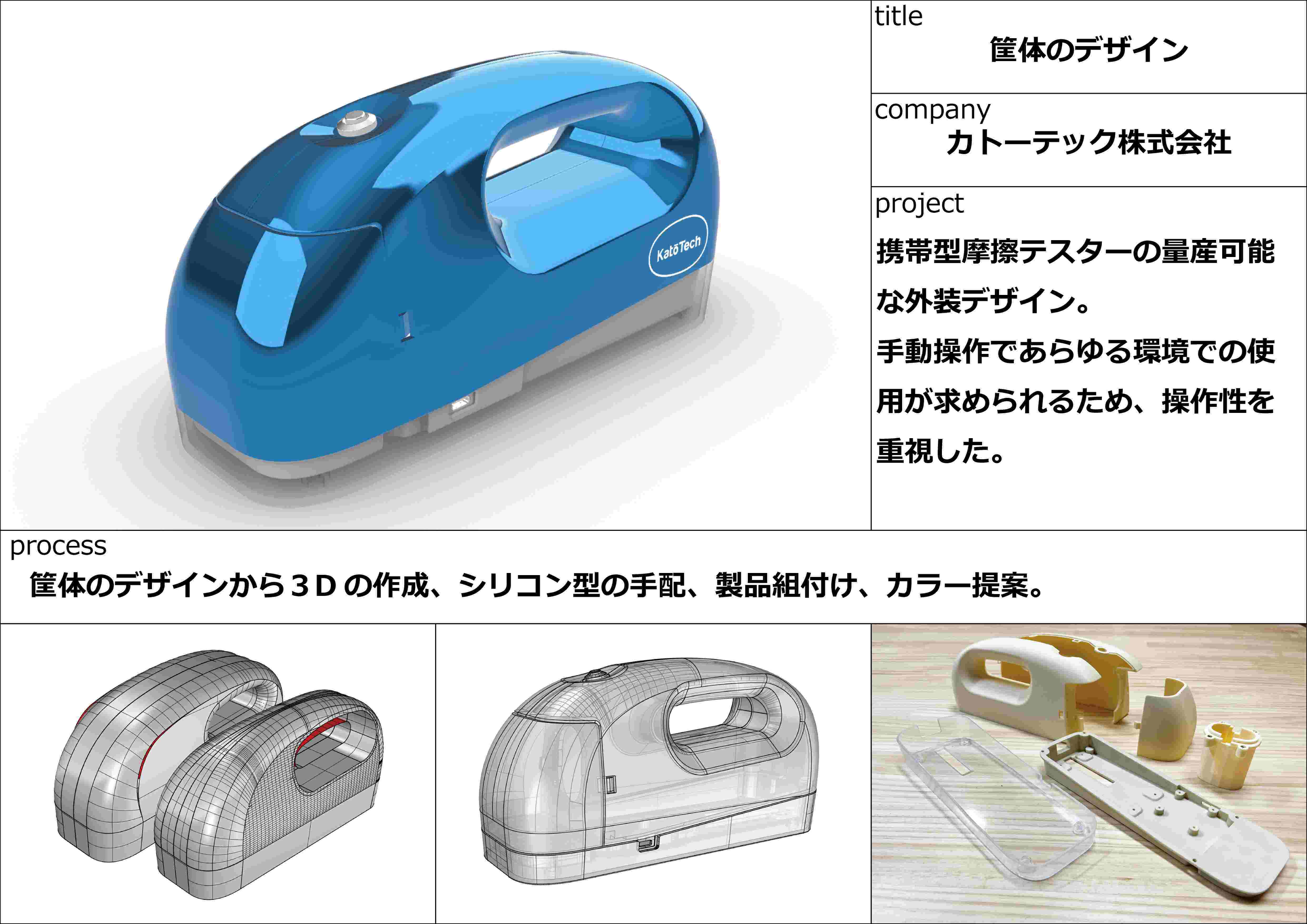 - モールドテックは、「作りたい」を「作れる」にする設計事務所として、デザインとエンジニアリングの両面からものづくりを支援することを強みとしています。お客様のニーズに合わせて、ヒアリングやイメージ、現物などから量産可能なデータを作成します。デザイン提案から製品設計、金型設計、治具設計まで、幅広い設計業務に対応可能です。 ・デザインデータの製作・量産に向けた製品形状最適化 ・仕様書のない状態からの金型や治具等設計から製作手配 ・リバースエンジニアリング