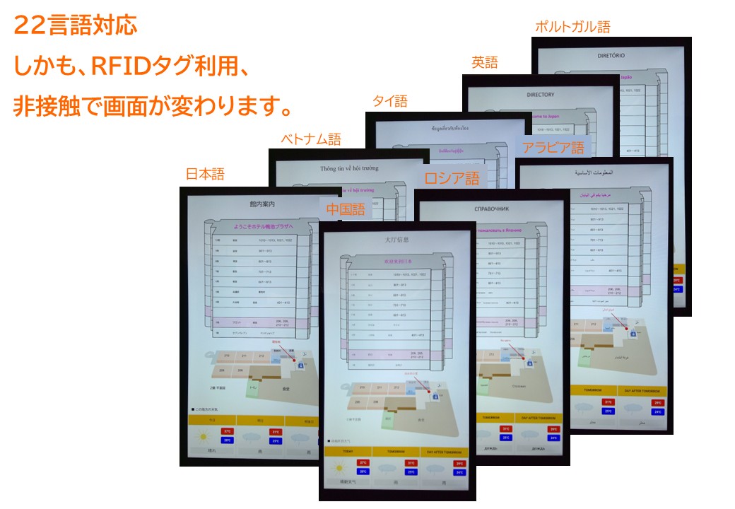 - RFIDは、世に出て早40年が経過し、皆さんも利用している交通系カードのsuicaやPASMOでもお馴染みの存在です。この様に今では決済にまで利用されているRFIDですが、交通系カードはHF帯(通信距離が15センチ程度)ですが、数メートルも確保できる商材が始まりです。 弊社は、通信距離を数メートル確保できるUHFタグを使い、人が持ち享受できるサービスを創造してます。 ①RFIDと人感センサを併用し、エリアでの関係者判断を可能にし「エリア判断センサ」 と、②RFIDタグに、言語を登録し、22言語の非接触多言語案内の「おもてなし案内」を展示してます。是非、RFIDの人利用のサービスを体験してください。