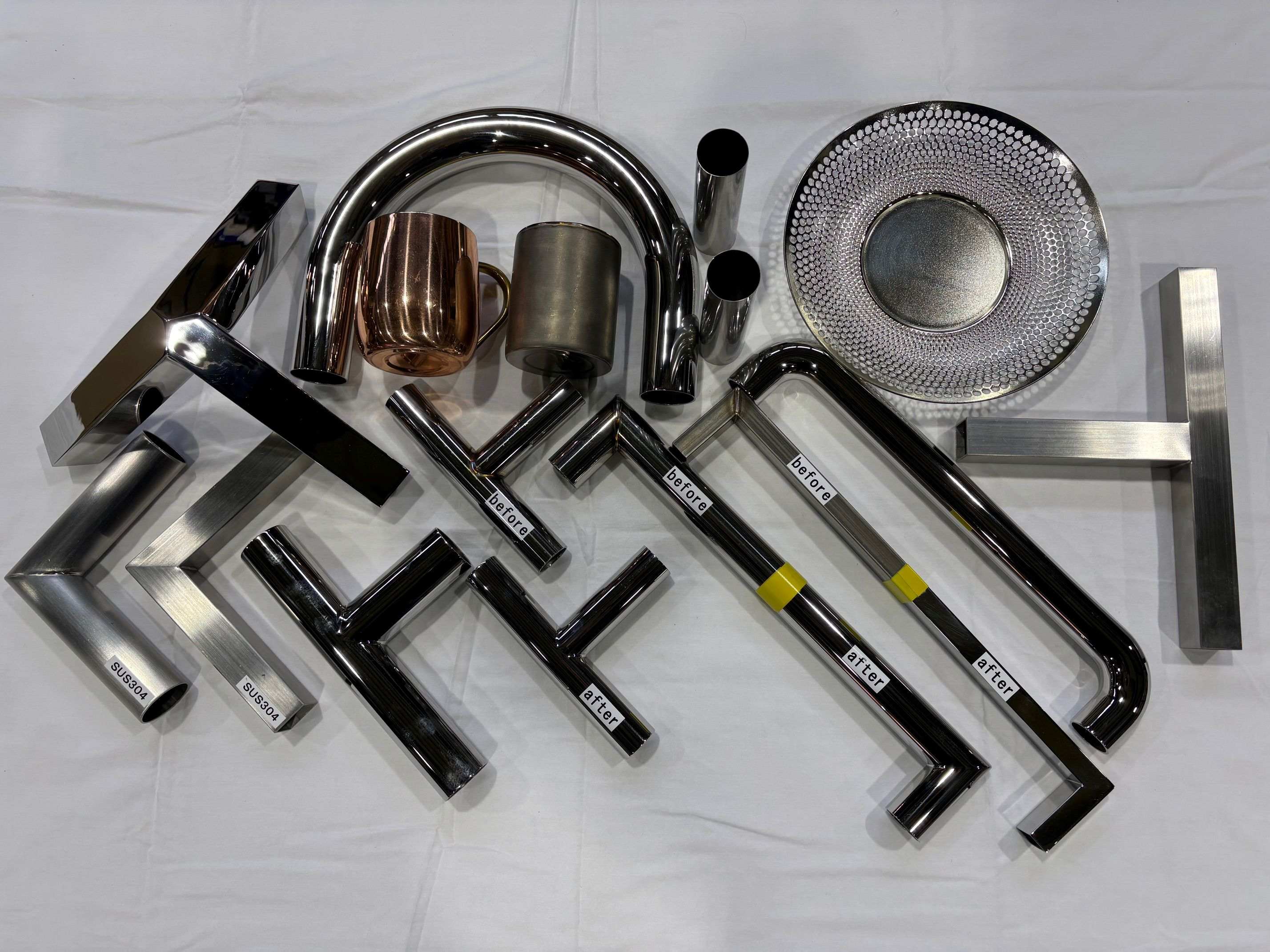 - パイプと板金部品による機械等装置フレーム、自動車・バイク・鉄道車両部品、金属什器、装飾品、医療、食品、など金属の特色である強度や衛生面を生かした製品のパーツサンプルを展示。 溶接による歪や変形を制御、矯正し、仕上げや研磨・表面処理にもひと手間をくわえ美しい仕上がりを提供。社内加工だけでなく新潟県燕三条地域の特色のネットワークを生かし、使用される用途に最適とされる材質、加工方法、溶接方法、仕上げ方法、一貫受注等様々なご相談に対応致します。
