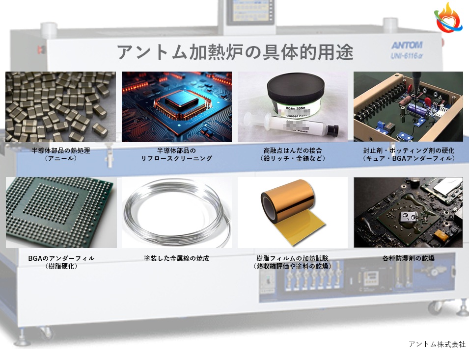 はんだ付けから半導体の熱処理まで、加熱に関することならお任せください。 アントム製リフローの内部構造を出展中です。