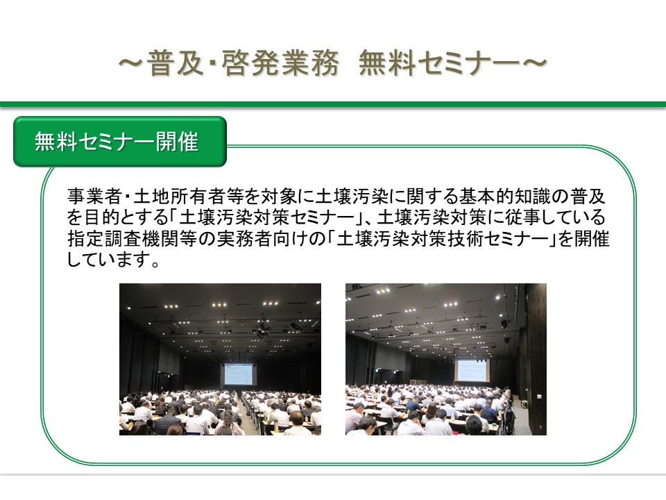 - 公益財団法人日本環境協会は平成14年に環境大臣から土壌汚染対策法に基づく指定支援法人に指定され、法に定められた支援業務を行っています。汚染の除去等の対策を行う土地所有者等に対しての助成金交付事業、土壌汚染対策法に基づいた調査や対策を行おうと考えている方、助成金の申請を考えている方への照会・相談事業、土壌汚染対策に関するパンフレットの配布、無料セミナーの開催、土壌汚染の専門知識をもった講師の派遣等の普及・啓発事業を行っています。