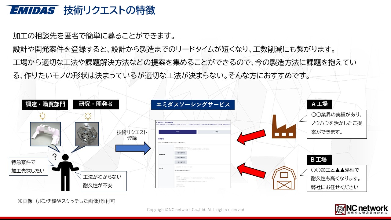- 新規サプライヤ探しをより簡単に。調達先・加工先が見つかるサービス「エミダスソーシング」 中小製造業や町工場の工場データが約22,000社登録されています。工場データは「保有設備(メーカー名や型番)」、「加工分類(マシニングや板金、溶接等)」、「ISO認証規格」等と紐づいています。このデータで検索や社内共有ができ、工場へ直接連絡・相談できます。また、探したい加工技術を匿名で募集する機能もあり、最短1日で工場からの提案を募ることが可能です。