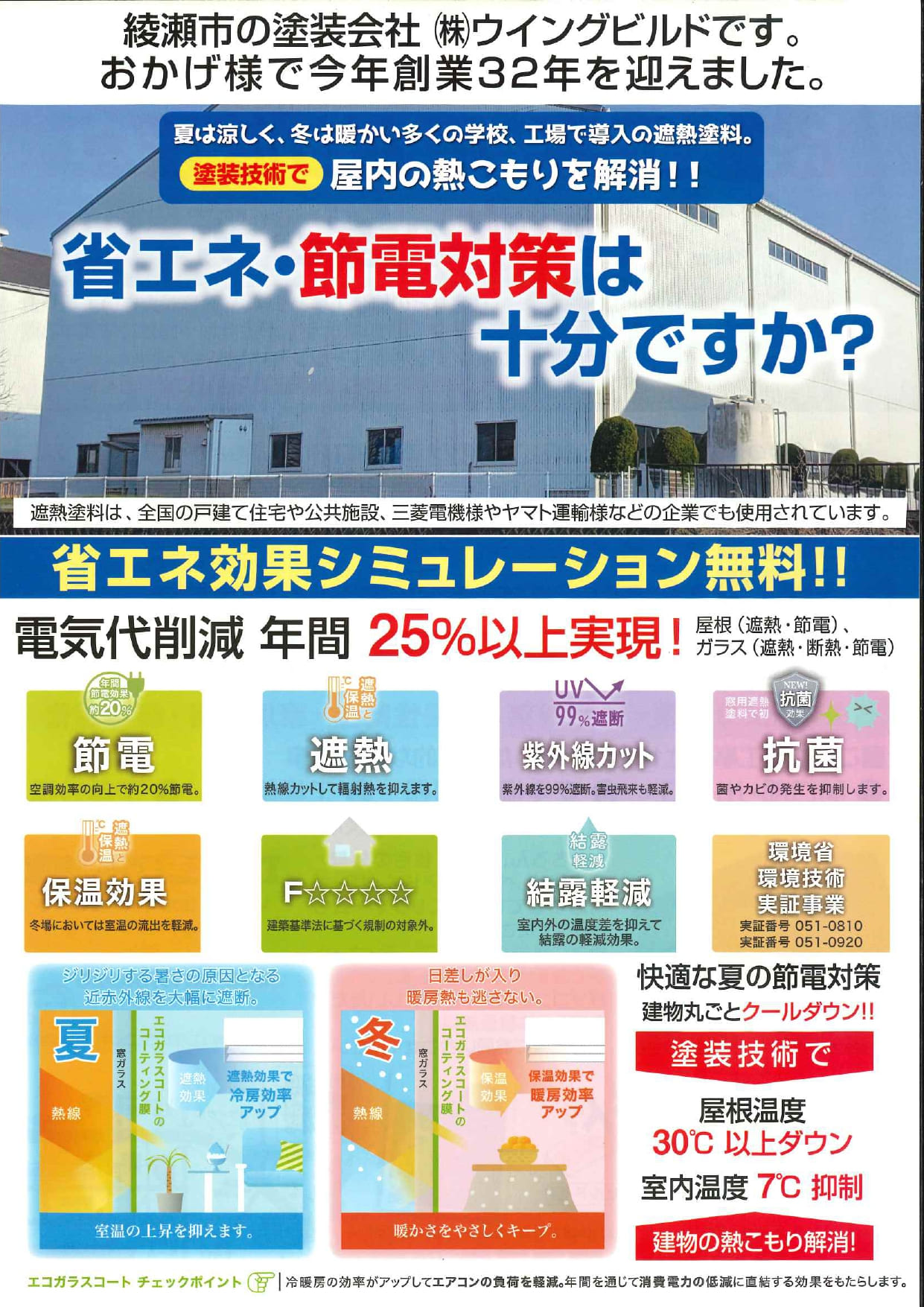 - 昨今の気象変動で、猛暑や豪雨など生活環境改善が必須です。特に企業では光熱費対策やオフィス環境改善が早急に求められています。ウイングビルドでは、塗装技術を中心に最新の遮熱シートをはじめ、お客様の目線に立ってご提案をさせていただきます。