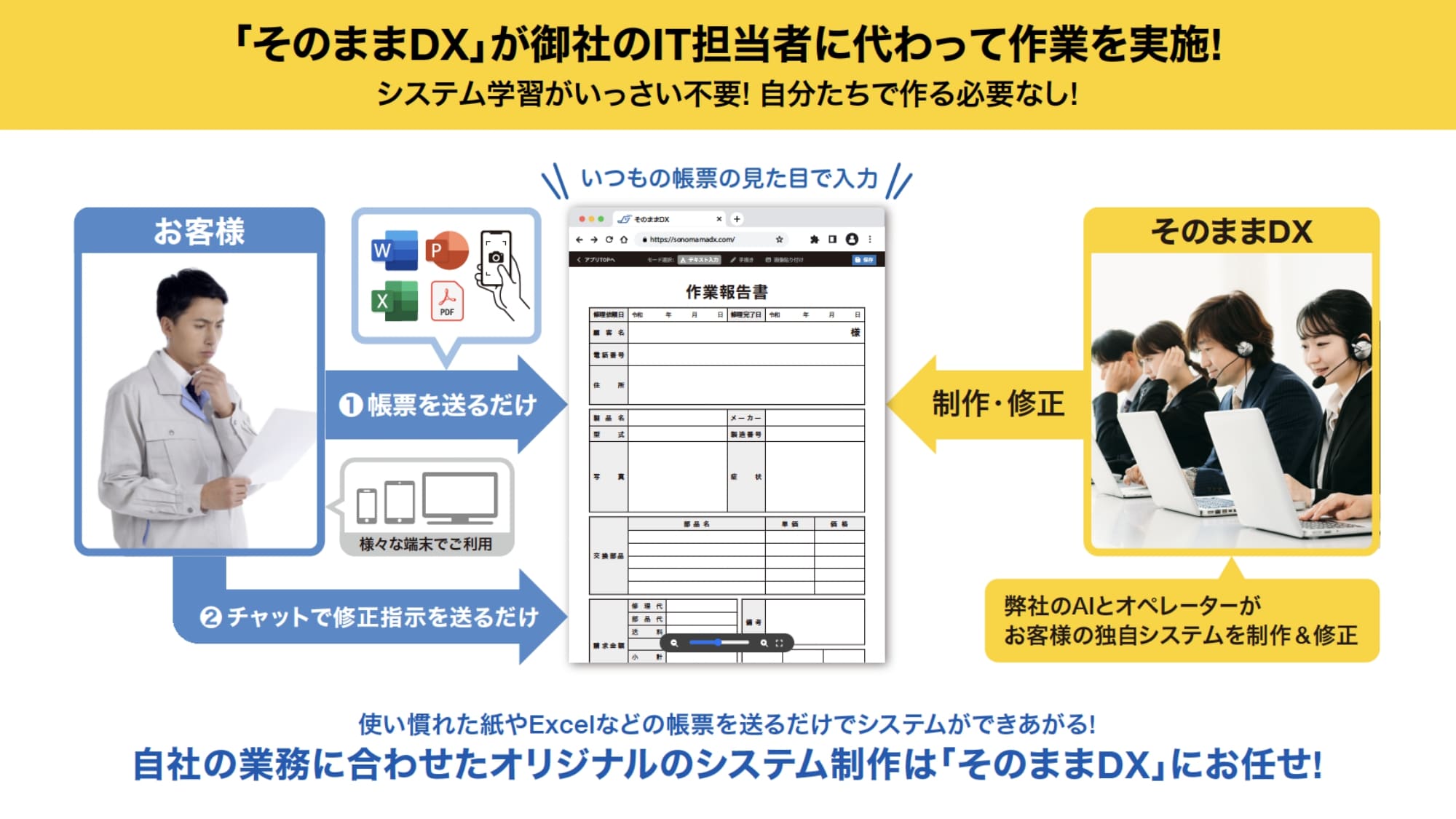 - 「そのままDX」は、使い慣れた帳票を送るだけで入力フォームを自動生成し、既存の業務フローを変えずに導入できる柔軟なシステムです。 煩雑なデータ収集や分析を一元化し、DX推進に必要な基盤を迅速に整備します。 さらに、収集データに基づき企業独自のDX戦略を構築し、意思決定のスピードと精度を高めます。 既存ツールとのシームレスな連携やAIによる高度な分析と連動することで、将来的な需要予測や多様な顧客ニーズへの迅速な対応を可能にします。 現場の声を最大限に活かした運用ができるため、企業規模を問わず誰でも簡単に始められる点も大きな魅力です。 業種を問わず幅広い用途に対応し、DXの最初の一歩をスムーズに支援します。
