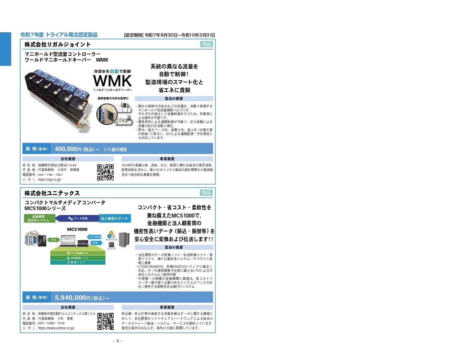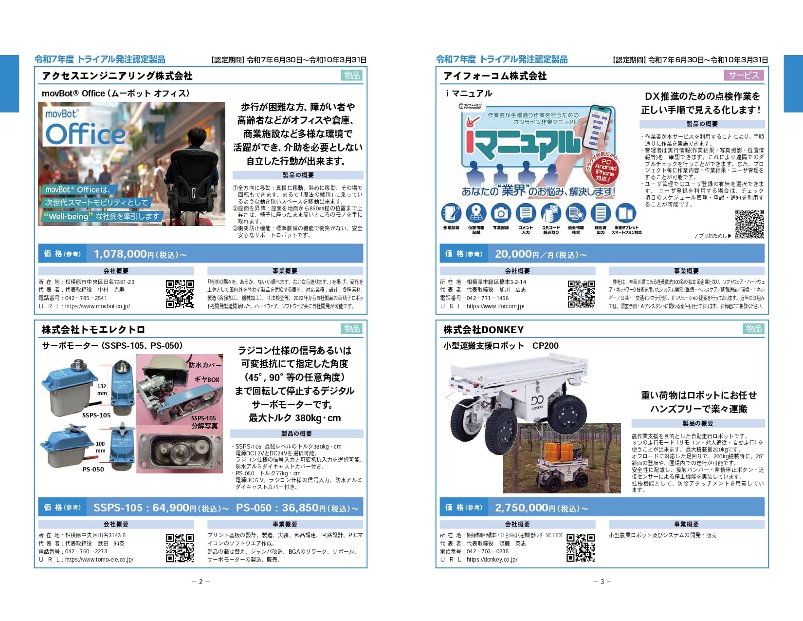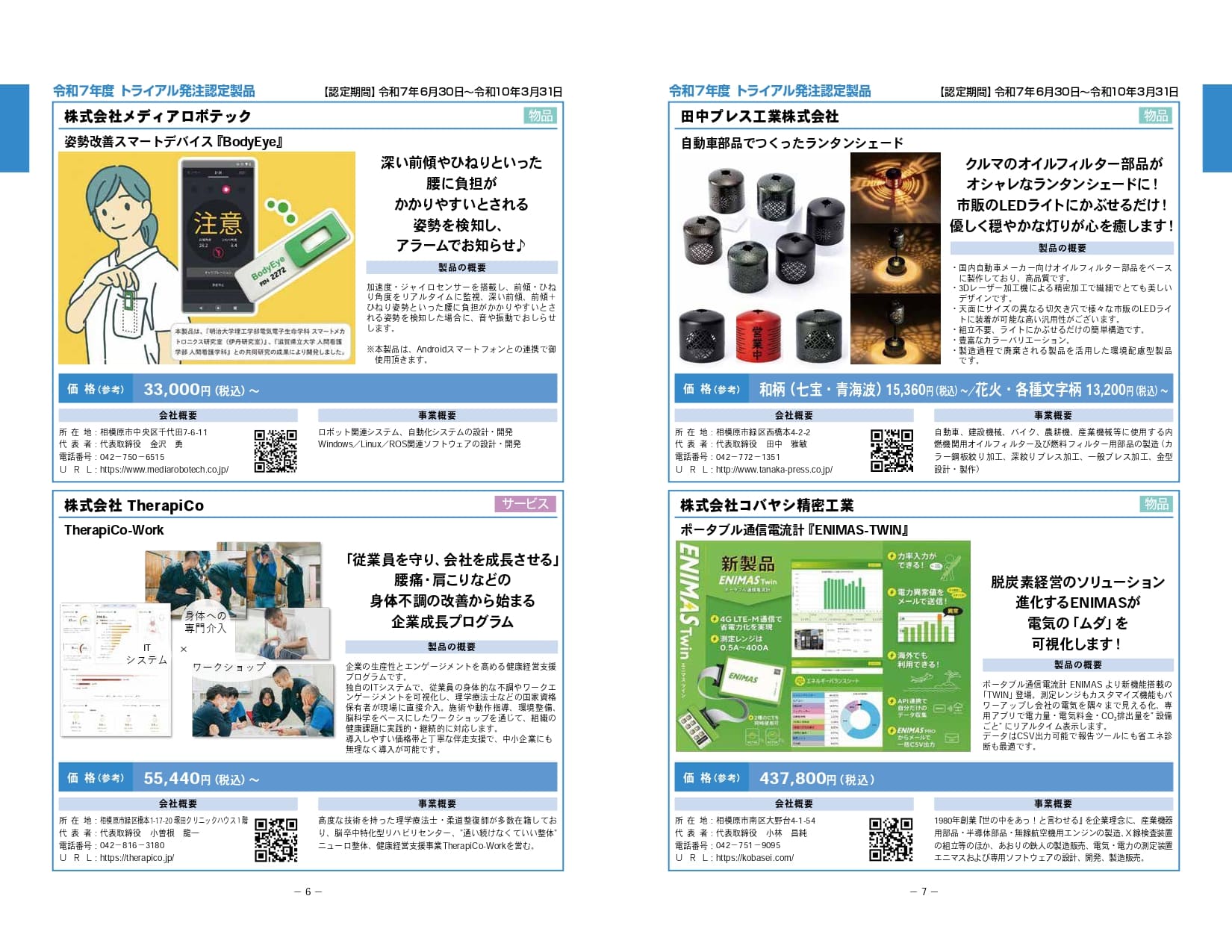 - 相模原市トライアル発注認定制度は、相模原発の優れた新製品や新サービスの販路開拓のため、市のHPへの掲載や、展示会への出展、市による試験購入などを通じて、積極的に市内外へ発信する制度です。当ブースでは令和7年度に認定された製品をご紹介いたします。各社のPRページもぜひご覧ください。 <出展企業(50音順)>株式会社アークホーム/アイフォーコム株式会社/アクセスエンジニアリング株式会社/株式会社キャロットシステムズ/株式会社コバヤシ精密工業/株式会社TherapiCo/田中プレス工業株式会社/株式会社トモエレクトロ/株式会社DONKEY/株式会社ネットフィールド/株式会社メディアロボテック/株式会社リガルジョイント