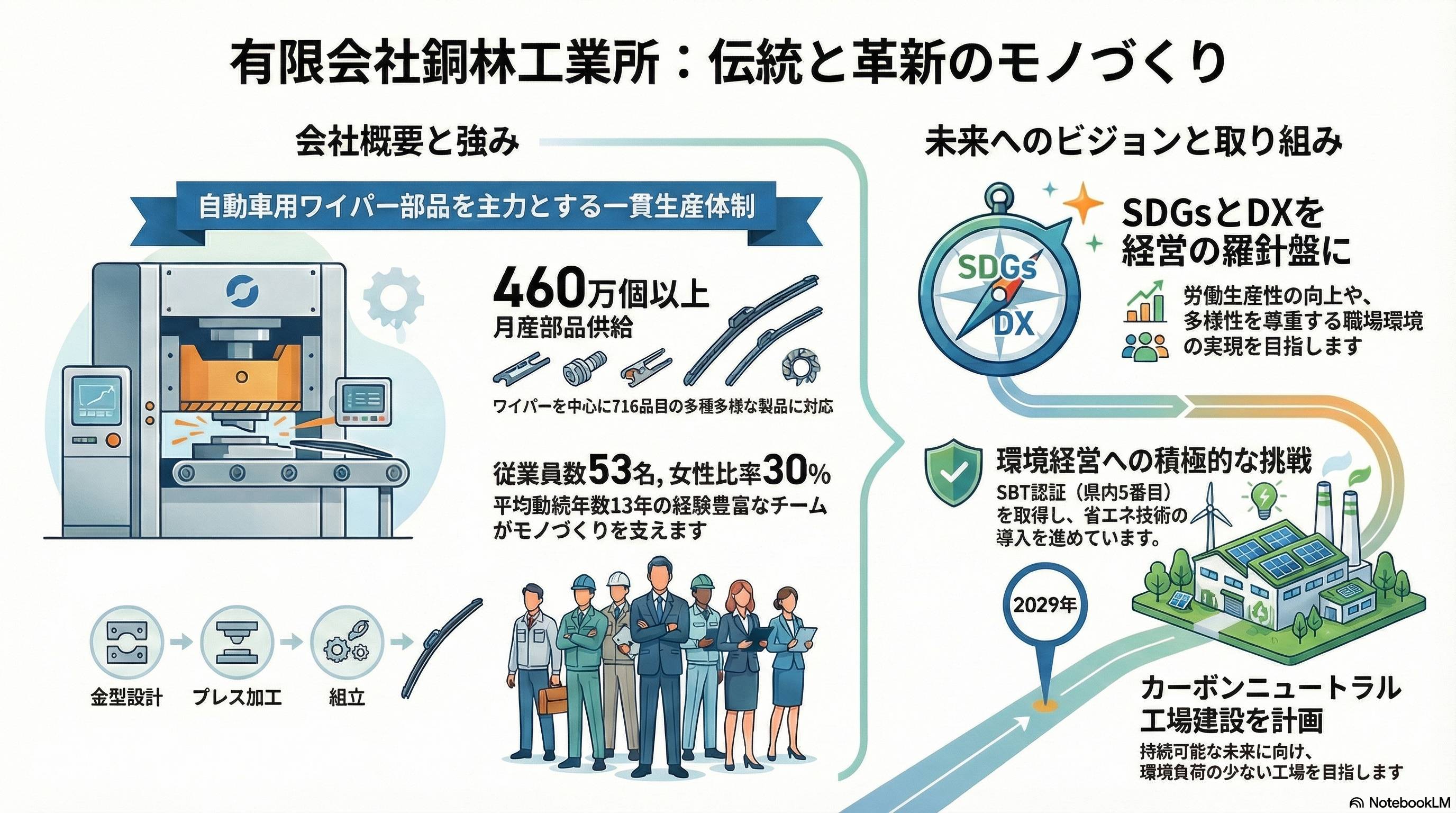 - 1947年創業より自動車産業を支えてきた技術力をベースに2030VISIONを掲げ サスティナブルなモノづくりを目指しております。 金型設計製作から金属量産プレス加工、スポット溶接、タッピング、組付を ワンストップで実現することでお客様の欲しいをカタチにします。