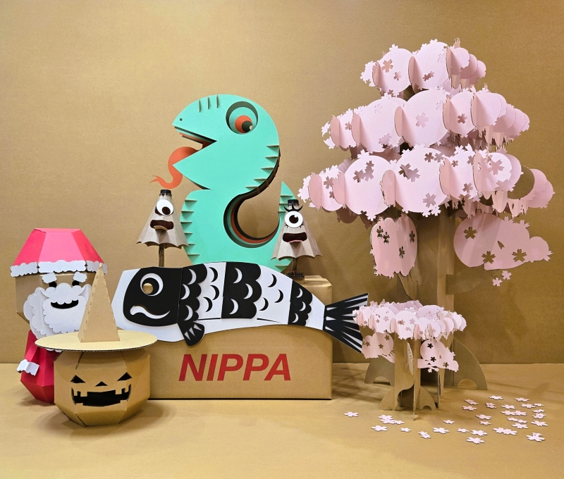 全部、段ボール。 耐久性・加工性・環境性を兼ね備えた段ボール素材の可能性を、実物を通じてご確認いただけます。 デザインした置物や什器を全て段ボールで作製しました。 見るだけでも大歓迎です。お気軽にお立ち寄り下さい。