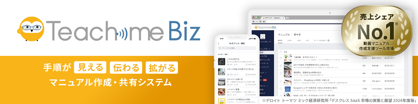 - Teachme Bizは、写真や動画を用いた手順書をクラウド上で簡単に作成・共有・管理できるサービスです。作業動画から手順書を自動作成するAI機能も搭載し、見やすい手順書を効率的に作成できます。 作業手順を視覚的かつ多言語でわかりやすく示せるため、不良品率の低減や、新入社員・外国人スタッフへの教育時間の短縮につながり、コスト削減に貢献します。 現在、国内外の2,100社以上で活用されています。