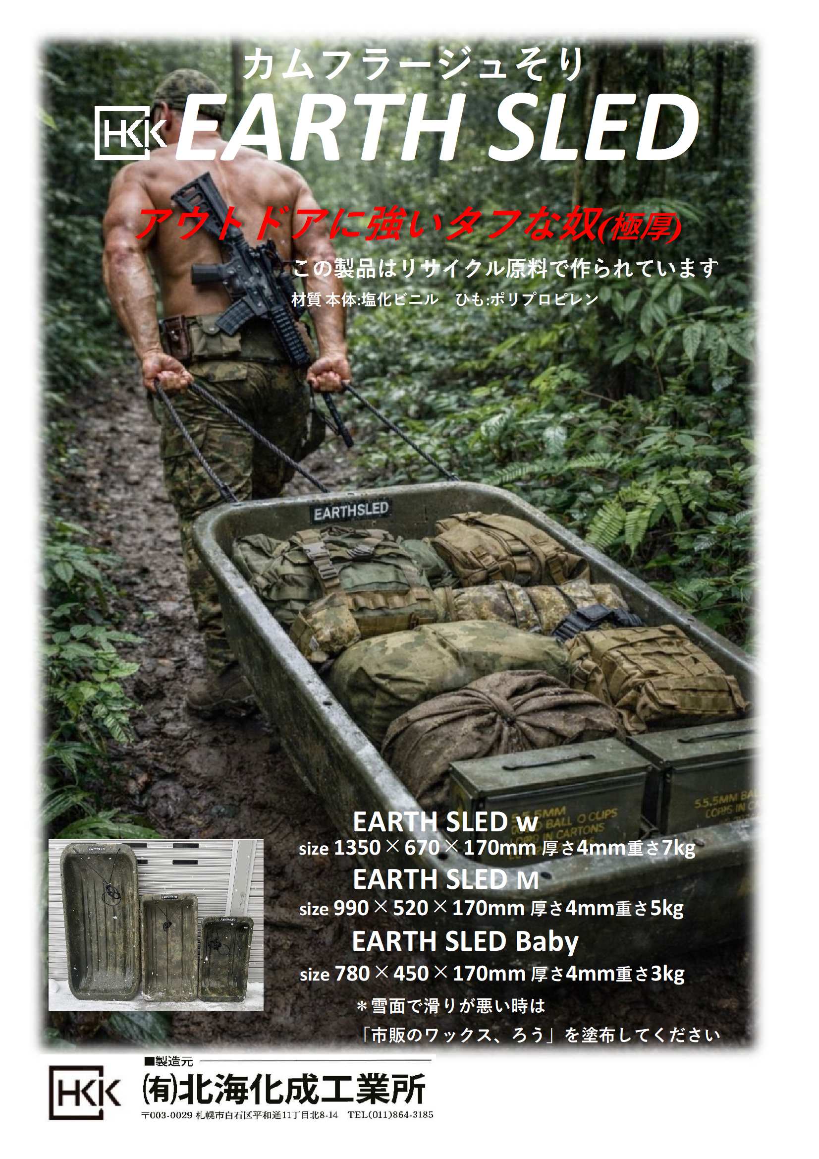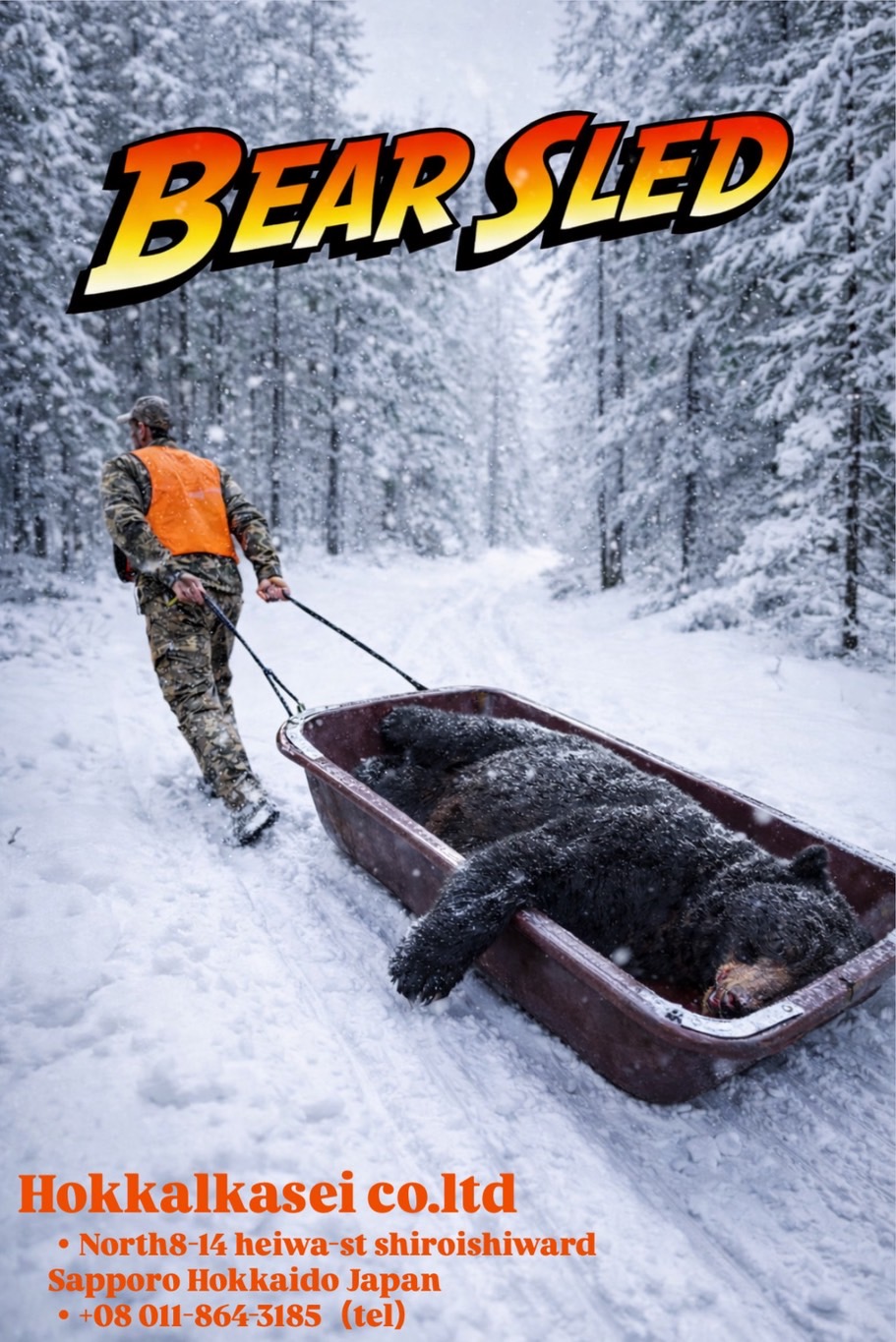 - ハンターとともに開発したクマ・シカ・イノシシ等大型動物回収専用ソリ「ベアースレッド」、台車を使用して納品・作業する方へ台車を乗せたまま雪面を走れる特殊ソリ「すいすいスレッド」、コアなアウトドア派に送るカモフラ柄に塗装した「アーススレッド」、を展示します。新しい開発も承っています、会場でご相談ください。