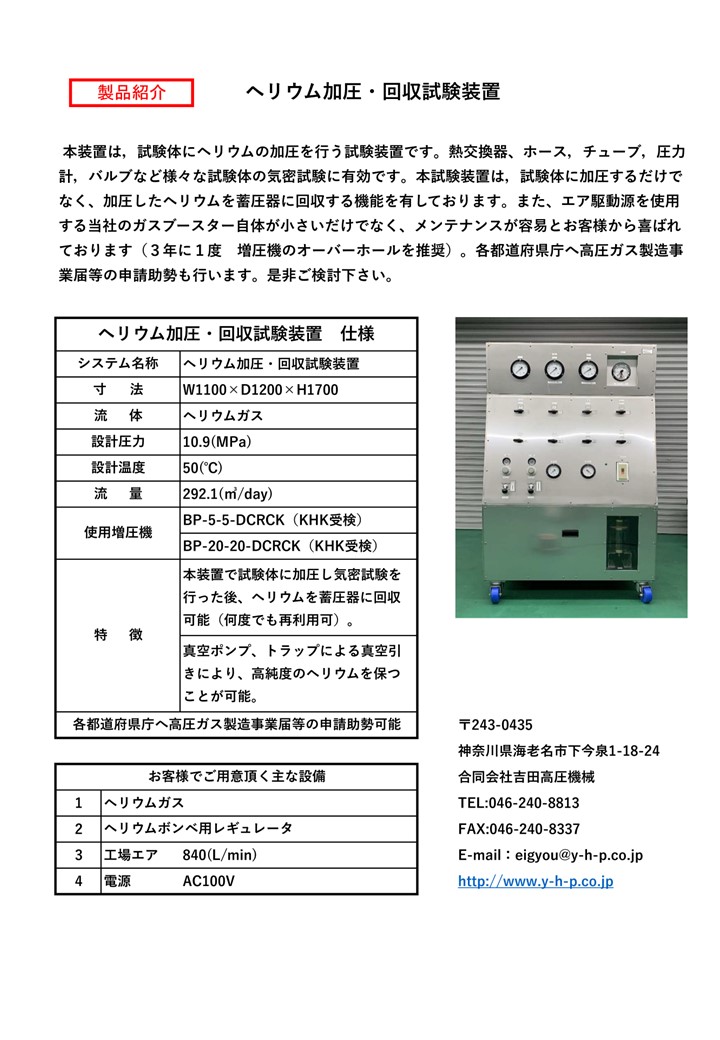 - 当社は、日本で数少ない自社製のエア駆動式高圧ポンプ製造会社です。当社の増圧機は、様々なお客様からのご要望にお応えし、改良を重ねた結果、耐久性が高くなりました。 本増圧機を用いた、気密試験機、耐圧試験機、破壊試験機、インパレス(脈動、繰返し衝撃)試験機、冷間等方加圧(CIP)装置導入の際は、お客様と打合せに充分時間を掛け、ご使用条件を考慮した高圧システムとして設計、製造、販売致します。 また、圧力計、安全弁等の保安検査、気密試験、耐圧試験、繰返し衝撃試験、脈動試験、破壊試験の委託検査を承ります。出張では、CIP装置、HIP装置、水素ステーション、高圧プラント等の高圧配管工事や耐圧試験、気密試験の実績もあります。