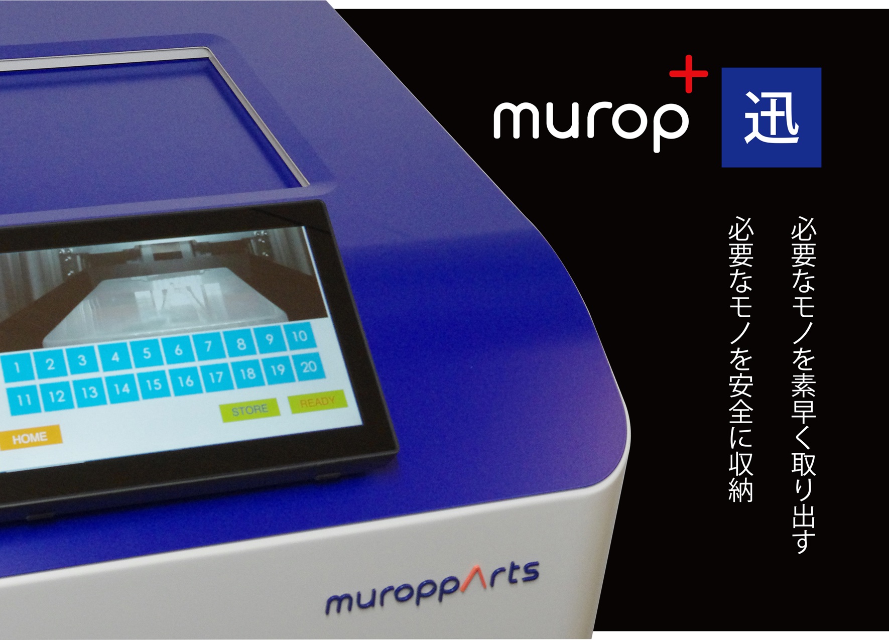 - muroppArts第一弾 小型自動倉庫のMurop+迅を出展します。 ユーザーフレンドリーな簡単な操作で A4サイズのトレイに入っている工具や書類を迅速に取出し・整理できます。 ブースで実機を展示していますので、是非ご覧ください。 本製品は自社仕様のため、御社向けにカスタムして販売を考えています。 導入企業募集中