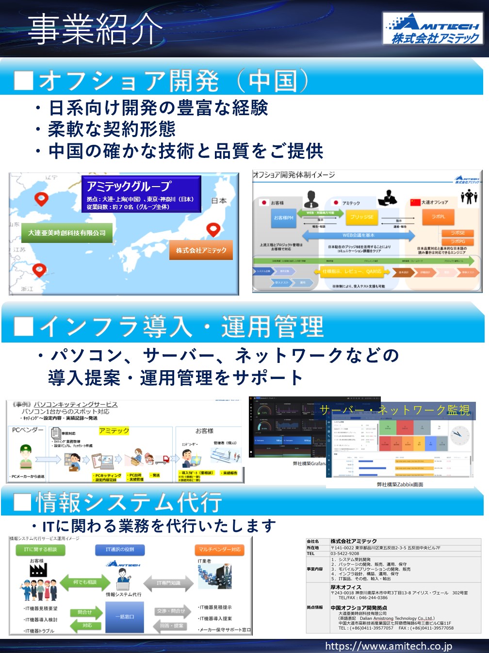- 弊社は「製造業のシステム導入 DX推進支援」をテーマに、ソフトウエア開発からインフラ運用・保守、BPOまで一貫したサービスを提供します。中国拠点との連携によるオフショア開発や日中ビジネスサポートを強みとし、グローバル展開を支援。IoT製品などを展示し、製造業の現場課題を解決しながらDXを加速させる具体的事例をご紹介します。