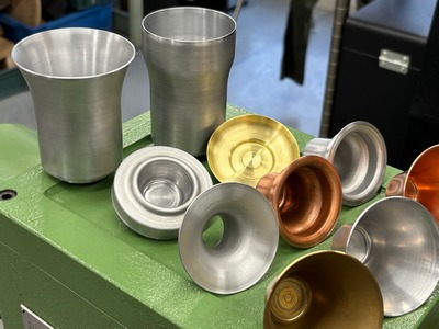 摩擦圧接接合をした部品・サンプル品を展示。 異種材接合部品など機械加工品・ヘラ絞り品など。 世界初の摩擦圧接&へらしぼり技術をつかった、おちょこの展示