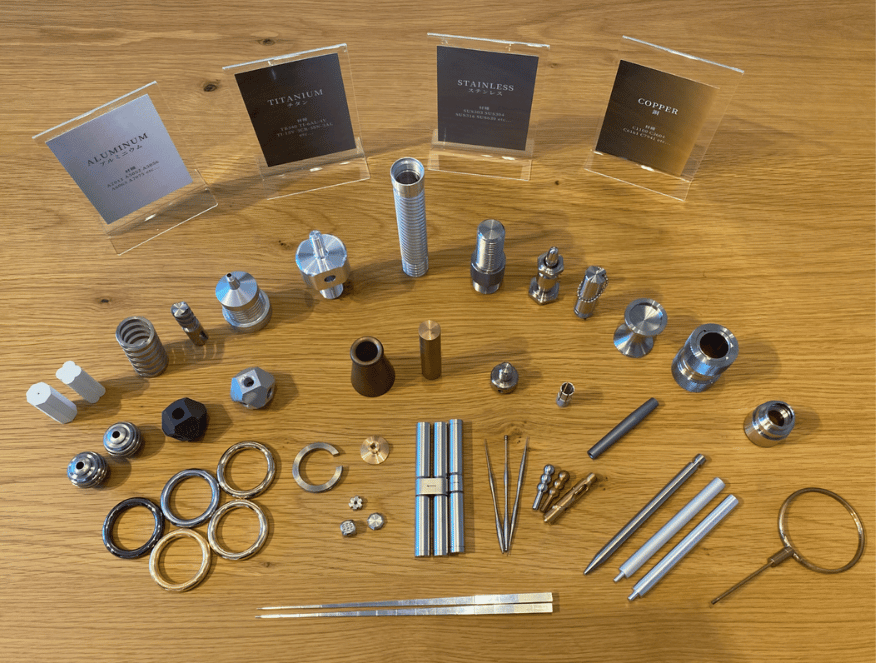 自社の挽物技術を最大限に活かして作成した機械部品サンプルと、機能美を追求した自社プロダクトを展示しています。